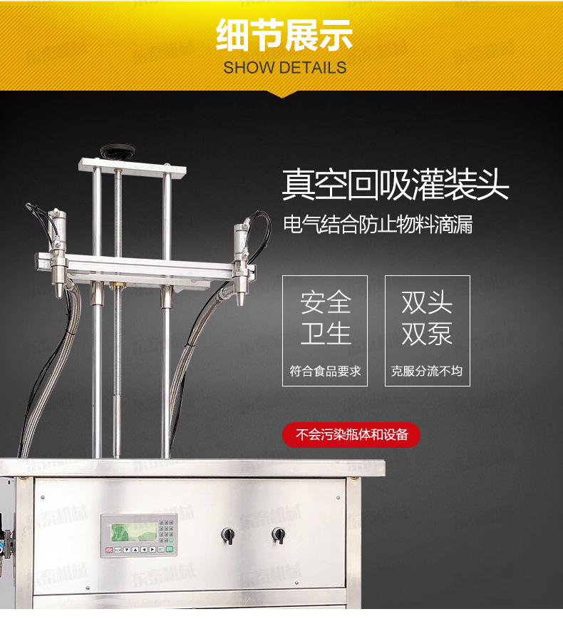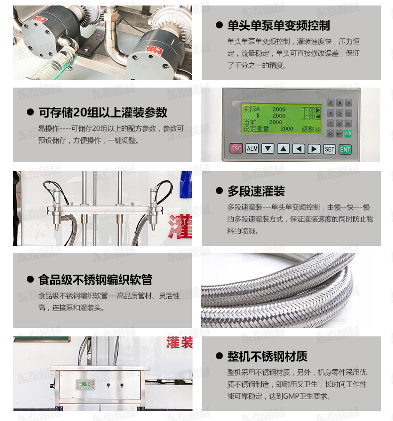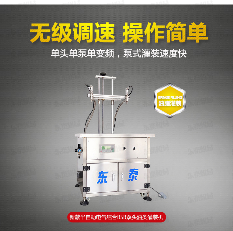 半自動(dòng)食用油灌裝機(jī)適用于各種食用油、潤(rùn)滑油等粘液體的定量灌裝,如花生油,大豆油,菜籽油、香油,潤(rùn)滑油等油類的灌裝。采用先進(jìn)的定量灌裝技術(shù),結(jié)合微電子智能控制技術(shù)單頭單變頻控制系統(tǒng),實(shí)現(xiàn)高精度、無級(jí)調(diào)速,操作簡(jiǎn)單。各個(gè)灌裝頭可在一定范圍內(nèi)任意調(diào)節(jié)間距和灌裝量,可使用各種大小形狀的容器的灌裝。自動(dòng)化程度高。另外,機(jī)身零件采用優(yōu)質(zhì)不銹鋼制造,即耐用又衛(wèi)生,長(zhǎng)時(shí)間工作性能可靠穩(wěn)定。達(dá)到GMP衛(wèi)生要求。本公司產(chǎn)品通過了IS9000質(zhì)量體系認(rèn)證。本設(shè)備經(jīng)久耐用,性能穩(wěn)定,是食用油、潤(rùn)滑油等行業(yè)理想的灌裝設(shè)備。