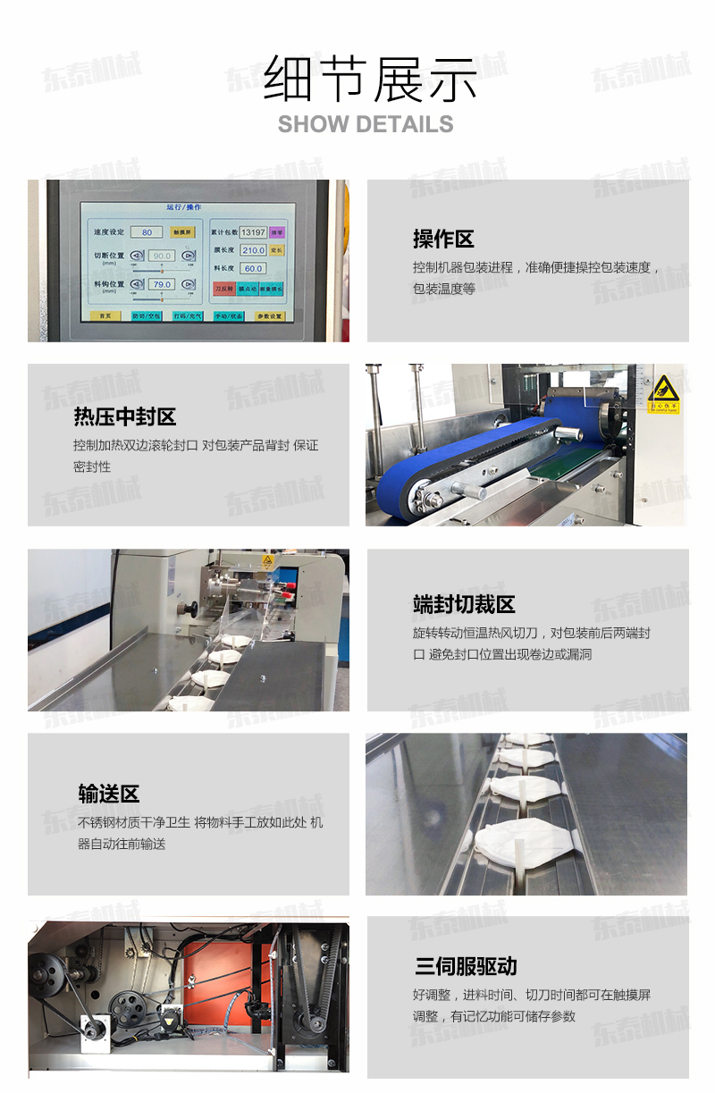 口罩包裝機可用于餅干、月餅、蛋黃派、米餅、雪糕、方便面、巧克力等塊狀產品的包裝,特別適合于小批量單一產品的包裝。