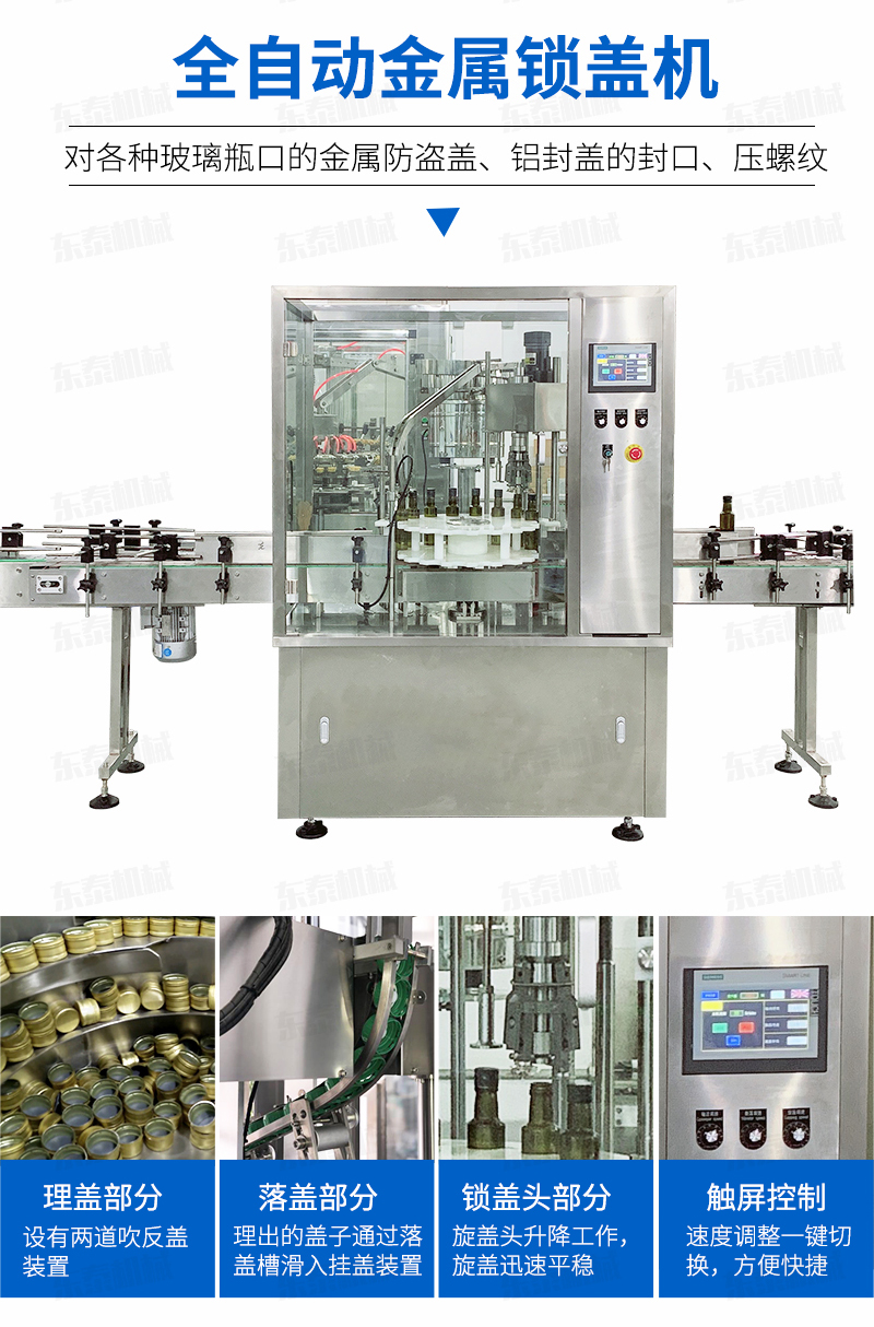本設(shè)備適用于食品、化妝品、化工等行業(yè),主要針對各種玻璃瓶口的金屬防盜蓋鋁封蓋的封口、壓螺紋等。該設(shè)備可單機使用,也可以與灌裝機等設(shè)備組成生產(chǎn)流水線自動作業(yè);