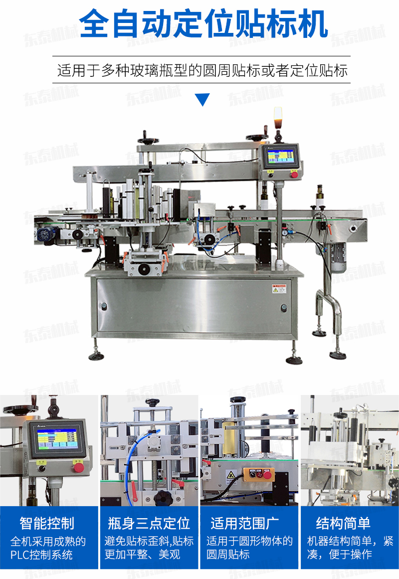 本機適用于食品、醫(yī)藥、化妝品及其它輕工行業(yè)中的扁瓶貼標、方瓶貼標、圓瓶貼標之理想設(shè)備。功能操作簡單,結(jié)構(gòu)緊湊。采用光電檢測,PLC控制,觸摸式軟件操作,輸送帶、扶正帶、頂帶、卷瓶帶均為無級變頻調(diào)速,具有貼標準確、精度高等優(yōu)點;同時具有無物不貼標,無標自動校正、自動檢測等功能。本機既可單機使用,也可與其它包裝機自動連線使用。