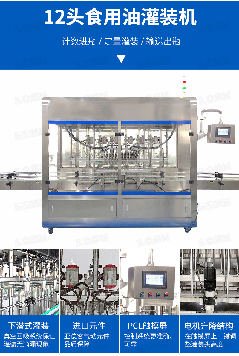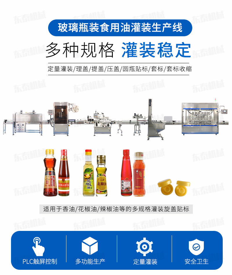 該系列灌裝機(jī)采用容積式計(jì)量灌裝原理,適用于各種規(guī)(100ml-1000ml)的南瓜籽油、榛子油、牡丹籽油、芝麻油、核桃油、山茶油、亞麻籽油、棉籽油、橄欖油、大豆油、玉米油、菜籽油等食用油灌裝。設(shè)備采用伺服驅(qū)動(dòng)活塞計(jì)量,保證了 1‰的灌裝精度,在保證灌裝精度的同時(shí),提高了 20%-35%灌裝速度,操作簡單,維護(hù)方便,節(jié)省人工成本,生產(chǎn)效率更高。