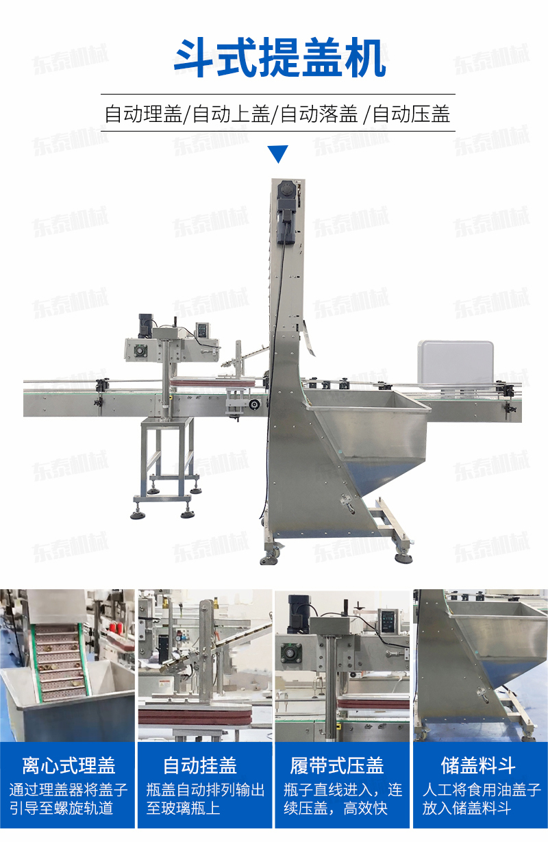 該提蓋式主要適用于制藥、食品、化工、日化等行業(yè),是自動(dòng)化生產(chǎn)線中旋蓋機(jī)、壓蓋機(jī)等的理想配套設(shè)備。采用底部添蓋替代傳統(tǒng)的手動(dòng)上蓋,使自動(dòng)化工作更加方便、快捷。特別是對(duì)于要求不能有磨損的瓶蓋如印刷好后的蓋子需要到下一步工序生產(chǎn)或者包裝等,此設(shè)備也可強(qiáng)有效的減少磨損;其工作原理是通過微動(dòng)開關(guān)檢測的作用,通過輸送刮板,把料斗里的瓶蓋按生產(chǎn)需要?jiǎng)蛩俚乃腿肜砩w器中,確保了理蓋器內(nèi)的瓶蓋能保持在佳的狀態(tài);
