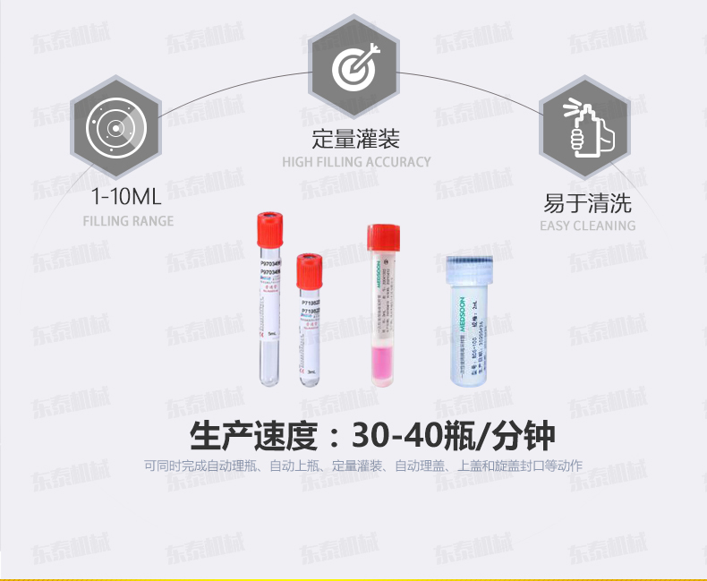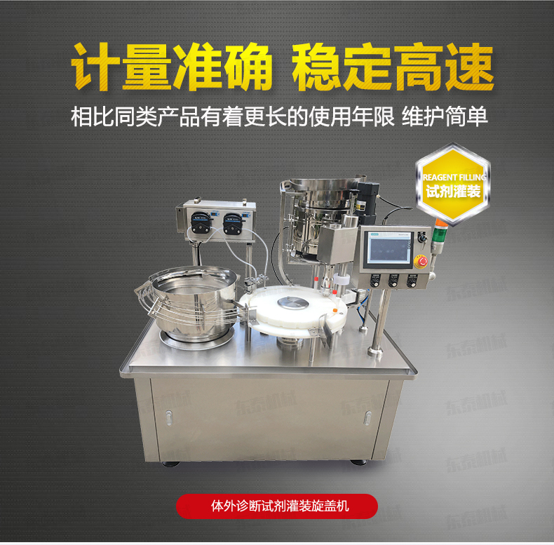 本機是在引進和吸收國外技術(shù)的基礎(chǔ)上,由我公司自主研發(fā)的一款I(lǐng)VD診斷試劑灌裝旋蓋一體機,能同時完成自動理瓶、自動上瓶、定量灌裝、自動理蓋、上蓋和旋蓋封口等動作。本機采用日本高精度封閉式凸輪分度工位器,精度高,運行可靠,使用壽命長。該分度器結(jié)構(gòu)簡單,長期使用無需維修。該型號設(shè)備主要用于ⅣD體外診斷試劑制藥、生物制藥行業(yè)及科研領(lǐng)域裝。機器設(shè)計緊湊合理、外形簡潔美觀,灌裝量調(diào)節(jié)方便。