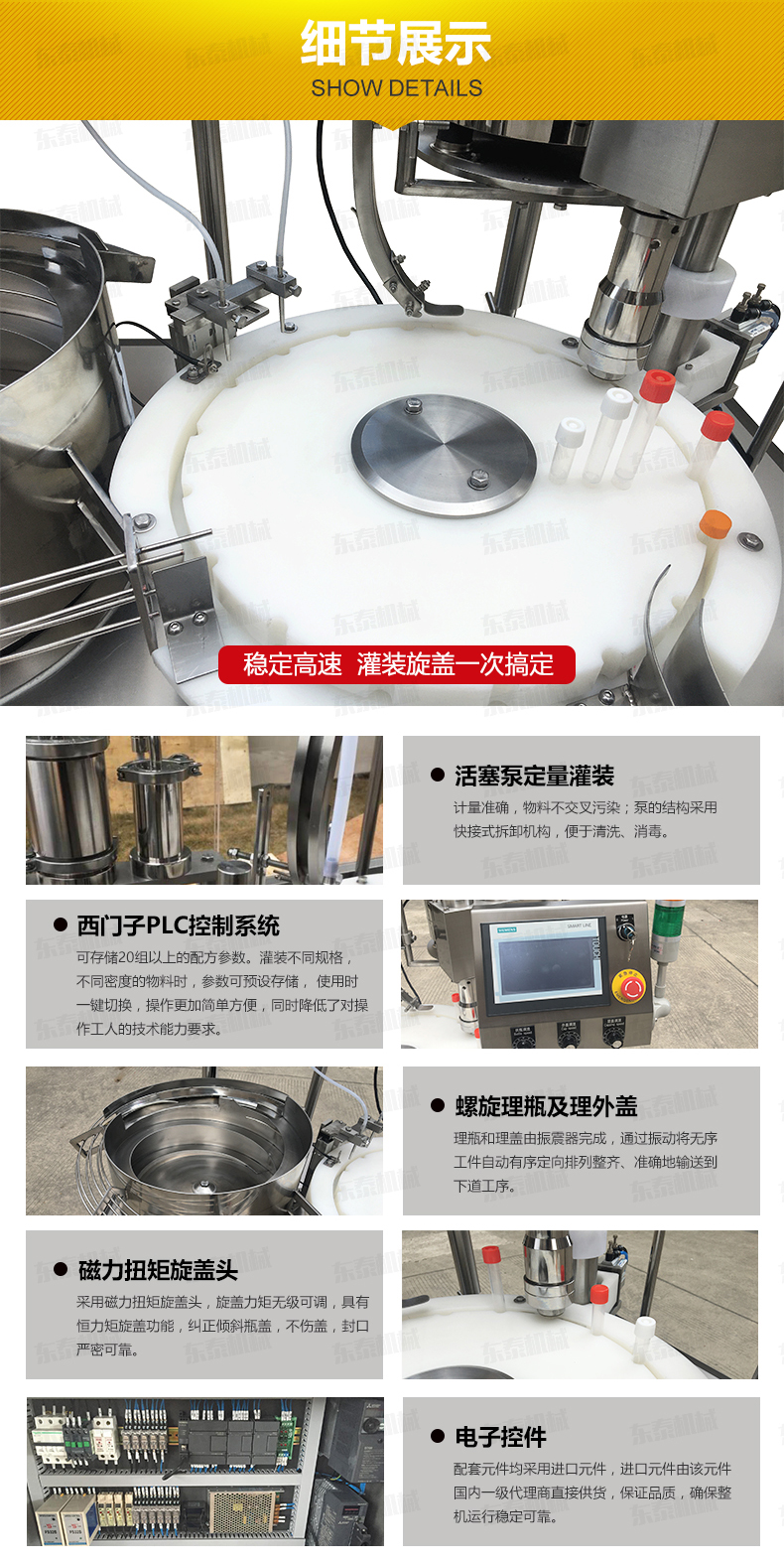 6、采用磁力扭矩旋蓋頭,旋蓋力矩無級可調(diào),具有恒力矩旋蓋功能,糾正傾斜瓶蓋,不傷蓋,封口嚴密可靠;