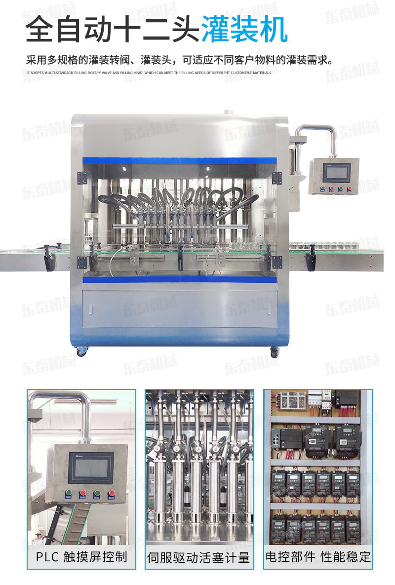 2、灌裝機以進口PLC電腦控制、伺服驅(qū)動計量,全彩色觸摸屏人機界面,一鍵完成計量切換確保容量之調(diào)整簡易、快捷、準確。是任何形式的灌裝機無法替代的;