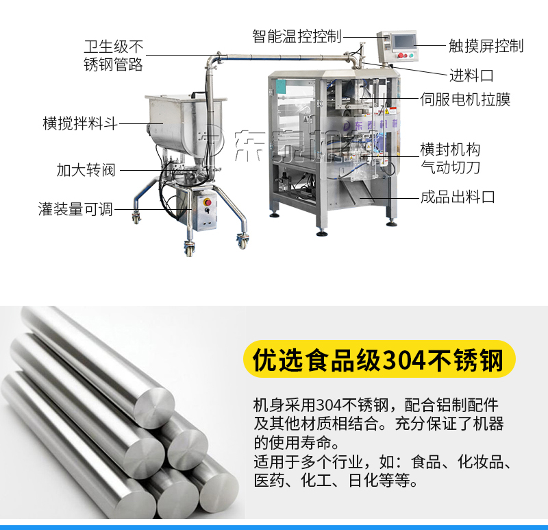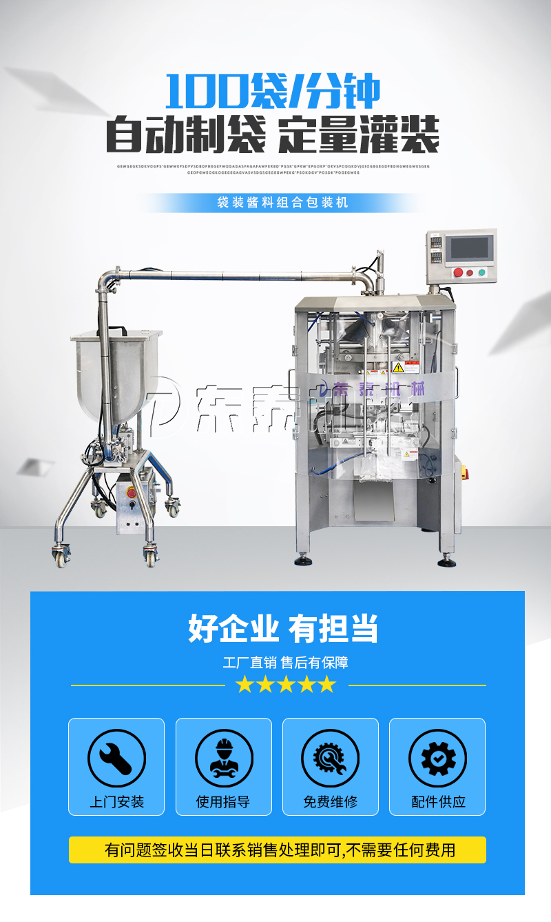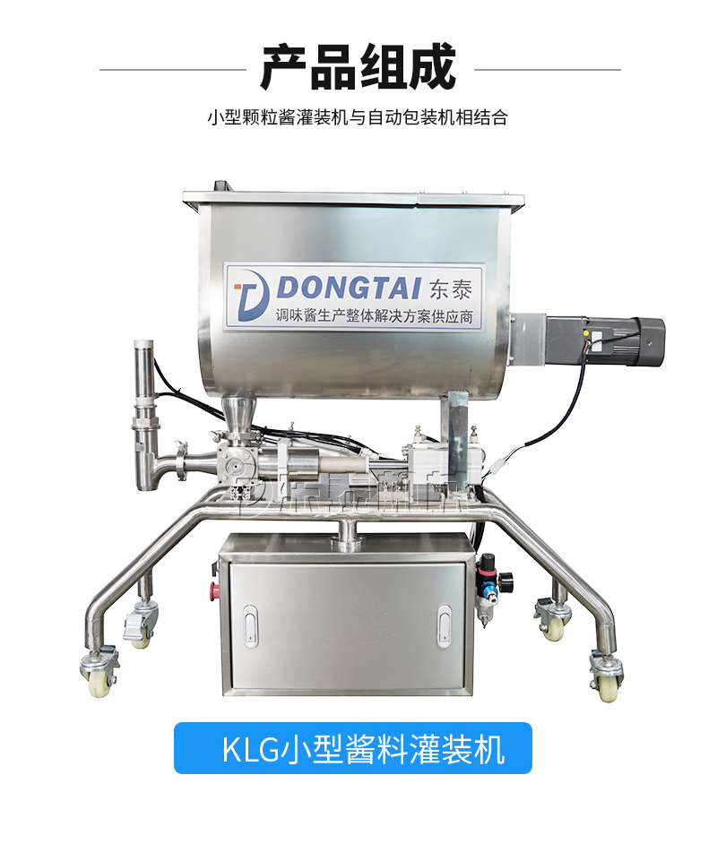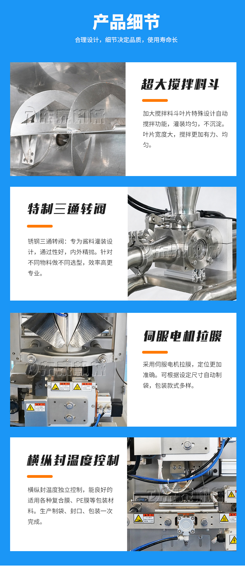 本機器主要用于調(diào)味品醬料的自動化包裝,機器安裝有橫向螺帶式攪拌,使油醬混合均勻,確保灌裝精度和產(chǎn)品包裝成品的均勻性。灌裝計量設備安裝有萬向輪,管路鏈接均采用快拆接頭,方便灌裝機拆卸移動清洗。包裝設備采用全伺服驅(qū)動器,包裝速度快,運行穩(wěn)定。