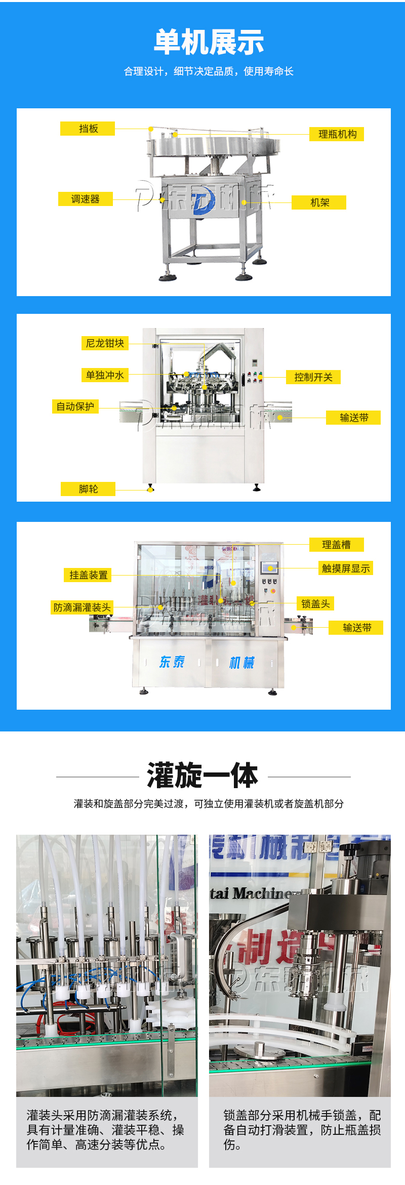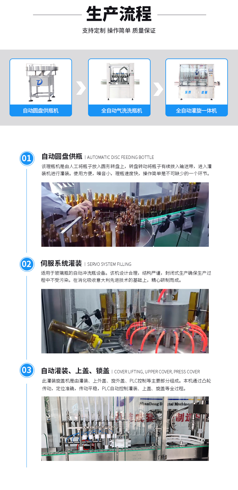 本灌裝流水線設備具有穩(wěn)定可靠、自動化水平高,相比同類產(chǎn)品有著更長的使用年限,維護簡單,整線中各設備的協(xié)調(diào)性、連貫性強,整線設計合理等特點。灌裝設備采用獨家專利系統(tǒng)結構,為當今行業(yè)內(nèi)水平,整線滿足量產(chǎn)化、集成化生產(chǎn)的需要。