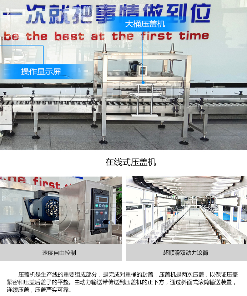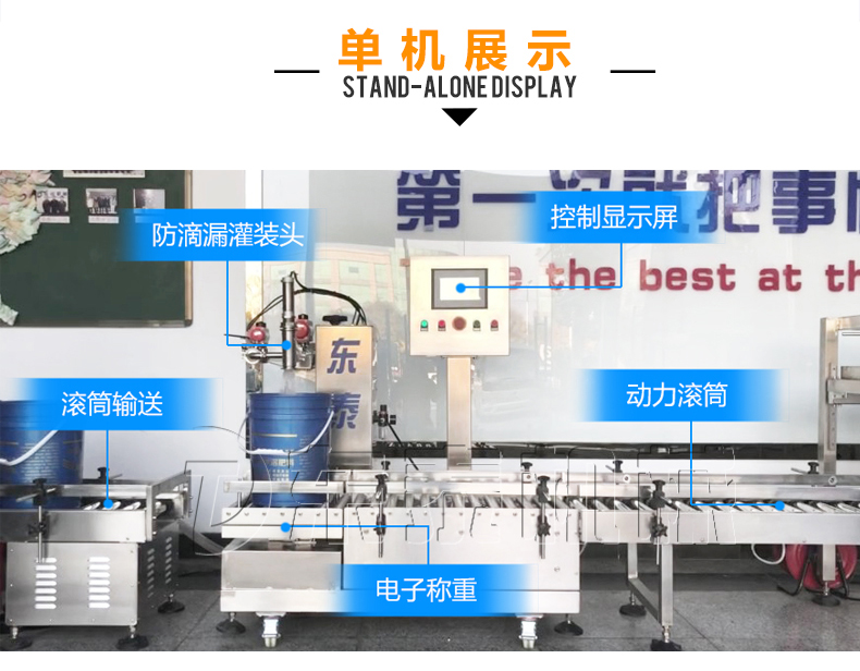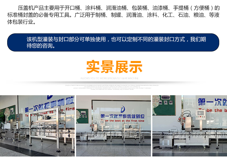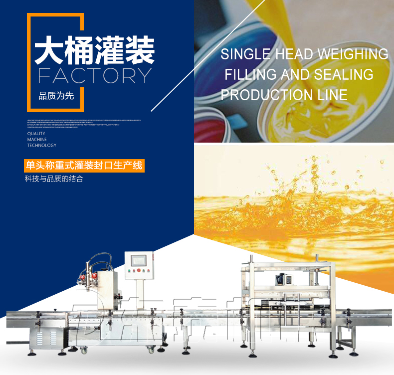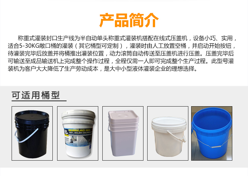 稱重式灌裝封口生產線為半自動單頭稱重式灌裝機搭配在線式壓蓋機,設備小巧、實用適合5-30KG敞口桶的灌裝(其它桶型可定制),灌裝時由人工放置空桶,并啟動開始按鈕,待灌裝完畢后放蓋并將桶推岀灌裝位置,動力滾筒自動傳送至壓蓋杋進行壓蓋。壓蓋完畢后可輸送至成品輸送機上完成整個操作過程,全程僅需一人即可完成整個生產過程。此型號灌裝機為客戶大大降低了生產勞動成本,是大中小型液體灌裝企業(yè)的理想選擇。
