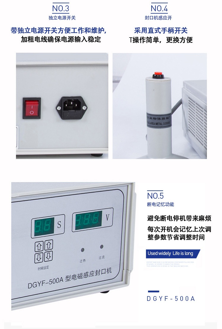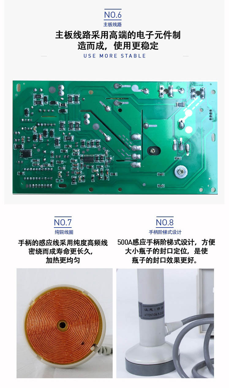 該封口機(jī)是一種便攜式電磁感應(yīng)加熱封口設(shè)備,專(zhuān)為制藥、化工、農(nóng)藥、食品、化妝品、輕工行業(yè)對(duì)容器進(jìn)行鋁箔嚴(yán)密封口。封口材質(zhì)使用廣泛,可以是聚乙烯、聚丙烯、聚苯乙烯、聚酯以及玻璃瓶,但不能用于金屬瓶體及瓶蓋。本機(jī)小巧輕便,使用簡(jiǎn)單,適用于小批量生產(chǎn)和實(shí)驗(yàn)室作業(yè)。本機(jī)采用國(guó)外先進(jìn)線(xiàn)路,選用日本最新模塊化功率器件,較于一般電子感應(yīng)加熱器更省電,熱效率達(dá)到90%以上,瞬時(shí)加熱速度為后者的20-30倍,因此不僅適用于熱封性能較好的聚乙烯、聚丙烯材質(zhì)的瓶體,而且對(duì)熱封性能較差的聚酯瓶、玻璃瓶也有極好的封口效果。