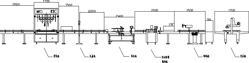 方案設計一:灌裝機+壓蓋機+貼標機+自動膠帽熱縮機+噴碼機+封箱機 |