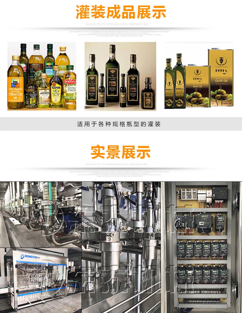 橄欖油采用PLC微電腦可編程控制,集光、機(jī)、電、傳感、氣動(dòng)執(zhí)行于一體。橄欖油灌裝流水線中的注射缸活塞行程采用伺服電機(jī)驅(qū)動(dòng),行程定位精卻,并設(shè)定了快慢速灌裝。當(dāng)灌裝量接近瓶口時(shí),速度壓力減小,以防物料因沖力大而飛濺溢出。該橄欖油自動(dòng)灌裝機(jī)自動(dòng)化程度高,調(diào)節(jié)方便,當(dāng)改變規(guī)格或修正計(jì)量時(shí)只需在顯示屏上調(diào)整即可滿足所需精卻計(jì)量。橄欖油自動(dòng)灌裝機(jī),橄欖油灌裝流水線可適用于植物油、蜂蜜、果醬、糖漿、制劑、懸浮劑、機(jī)油和日化行業(yè)各種粘稠物料的灌裝。
